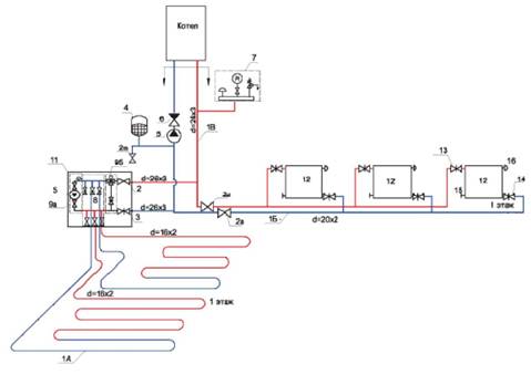 Схема комбинированного отопления помещений одного этажа дома или квартиры. Отопление плюс теплый пол. Ручное регулирование температуры в помещениях. Горизонтальная двухтрубная разводка.