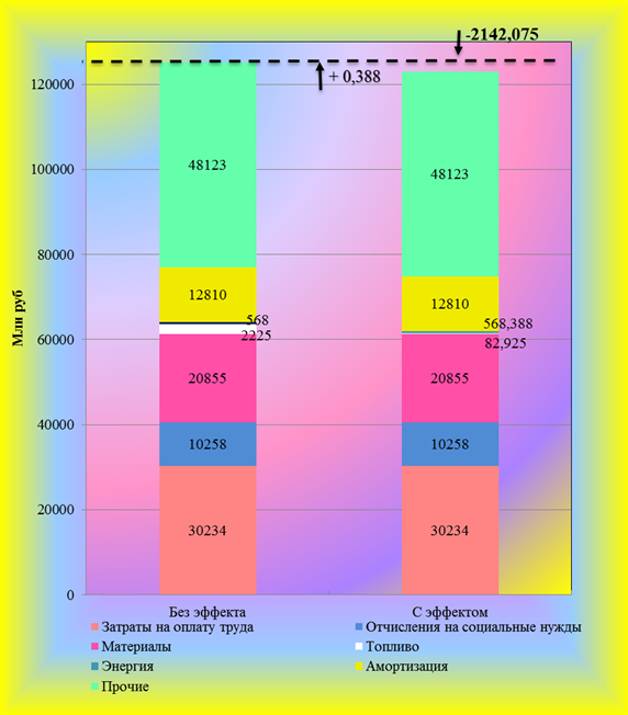 Внедренное мероприятие снизило затраты на топливо на 2142,075 млн руб, но увеличило затраты электроэнергии для работы вспомогательного оборудования на 0,388 млн руб,.