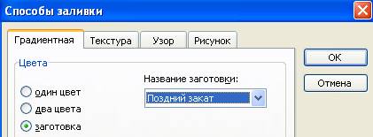 и выберите в списке пункт Способы заливки. В открывшемся диалоговом окне Способы заливки перейдите на вкладку Градиентная. В группе Цвета установите переключатель Заготовка. В раскрывающемся списке Название заготовки выберите пункт Поздний закат.