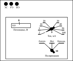 Основными элементами лабораторной установки, схема и приборная панель которой приведена на рис. 9, являются рабочий 1 и вспомогательный 3 электроды; U-образный сосуд-электролизер 2; насыщенный хлорсеребряный электрод сравнения 4; электронный вольтметр 8; регулятор величины поляризующего тока 9; переключатель поляризации 10 и соединительные провода.