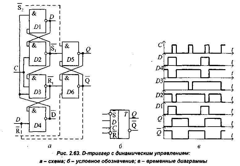 На практике широкое распространение получили D-триггеры с прямым динамическим управлением по схеме "трех триггеров". Схема такого D-триггера с прямым динамическим управлением показана на рис. 4.41, а, а его условное графическое изображение — на рис. 4.41, б.