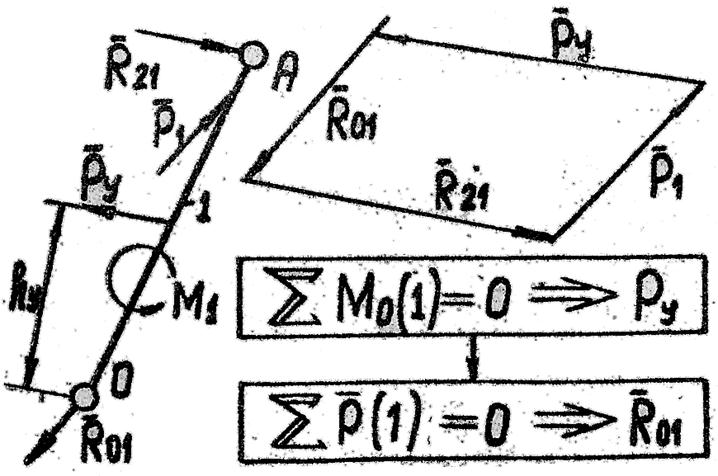 9. Записываем уравнения равновесия для начального звена, прикладывая действующие на него силы, включая уравновешивающий силовой фактор и силу его взаимодействия с группой Ассура, первой в порядке наслоения.