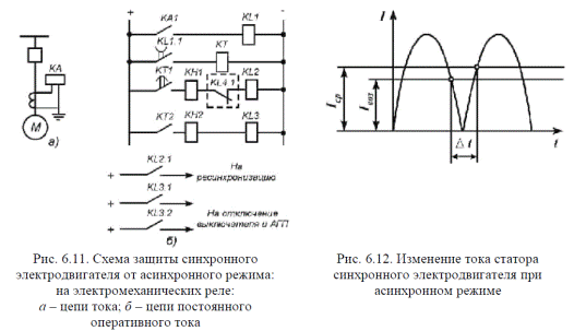 Защита от междуфазных повреждений выполняется мгновенной в виде токовой отсечки или продольной дифференциальной защиты. Отличие заключается в том, что РЗ синхронного электродвигателя одновременно с выключателем отключает АГП. При применении тиристорного возбуждения и отсутствии АГП защита действует на инвертирование возбудителя. Ток срабатывания отсечки отстраивается от пусковых токов и токов самозапуска электродвигателя. Крупные электродвигатели оборудуются продольной дифференциальной РЗ в двухфазном исполнении. Защита от замыканий обмотки статора на землю применяется при токах замыкания на землю более 5–10 А. Защита от перегрузки обычно выполняется совмещённой с РЗ от асинхронного хода (см. рис.6.11).