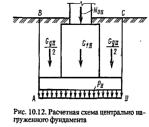 — расчетные значения веса фундамента и грунта на его уступах (рис. 10.12); А — площадь подошвы фундамента.