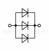 Диоды, включенные параллельно, можно видеть на рис. 1. Если каждый из них имеет прямой ток 1 А и максимальное обратное напряжение 100 В, то параметры всей цепочки будут соответственно 3 А и 100 В. Т.е. при параллельном включении пропорционально количеству возрастает прямой ток, а максимальное обратное напряжение не меняется.