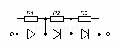 Как правило, такие резисторы имеют сопротивление в районе 510 КОм. Это шунтирование обеспечивает выравнивание напряжения на соединённых диодах.