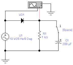 Сурет 1 – Біржартылай периодты түзеткіш схемасы (а), активті жүктемедегі сыйымдылықты сүзгі қосылмаған сигналдардың осциллограммасы (б), активті жүктемедегі сыйымдылықты сүзгі қосылған сигналдардың осциллограммасы (в)