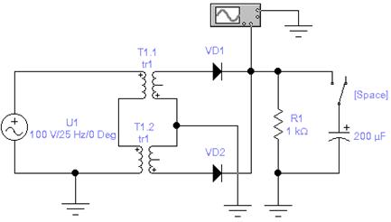 Сурет 2 – Трансформатордың екінші орамдағы ортақ шығысы бар екіжартылай периодты түзеткіш (а), активті жүктемедегі сыйымдылықты сүзгі қосылмаған сигналдардың осциллограммасы(б)