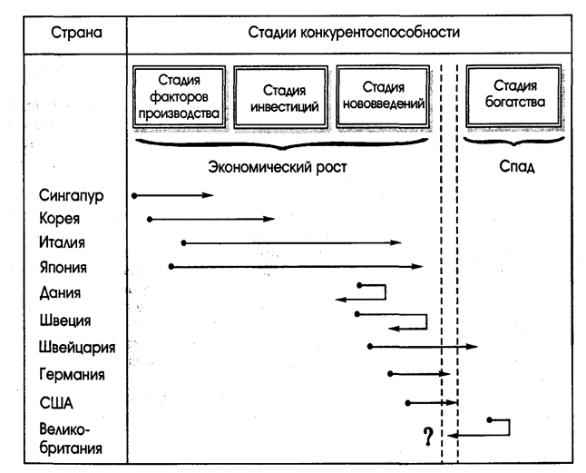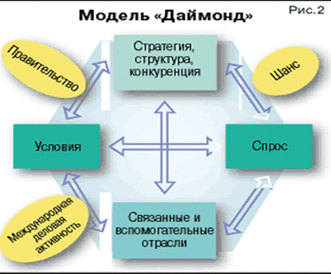 Профессор Гарвардской школы бизнеса Майкл Портер в 1990 г. выпустил монографию «Конкурентные преимущества наций». Он попытался выявить причины успеха страны в международной конкуренции в той или иной отрасли с помощью системы четырех показателей — «конкурентного ромба».