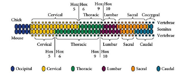 Сравнение экспрессии Hox-генов в курином и мышином эмбрионе выявляют различия в протяженности (но не порядке!) доменов экспрессии некоторых генов. Так, ген Hox 5 в длинной шейной области курицы экспрессировался в > чем 13 сомитах, а у мыши – в 6-7 сомитах. Т.е. НОХ-гены действительно детерминируют разные отделы тела эмбриона вдоль передне-задней оси!