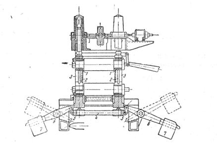 Грузовое уравновешивание применяется также для установки среднего валка в станах трио Лаута (фиг. 318, а и б), но здесь оно связано с работой подъемного стола. Каждая цапфа среднего валка помещена в подшипнике коленчатого рычага 1, который подвижными стержнями в местах 2 и 3 скреплен со станиной. На подвесных тягах 4 к рычагам прикреплены противовесы 5. Имеются еще вторые противовесы, 6, соединенные с одной стороны с теми же подвесными тягами 4, с другой — с кривошипным валом качающегося стола. При поднятии качающихся столов поднимаются связанные с ним вторые противовесы 6. При этом средний валок перевешивает первые противовесы 5, связанные с ним несущими рычагами, и опускается вниз. При подъеме среднего валка качающиеся столы опускаются и связанные с ними противовесы садятся на нижние, поднимая валок кверху, так как вместе они тяжелее валка.