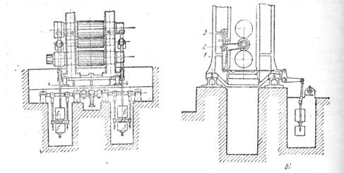 Фиг. 318. Грузовое уравновешивание среднего валка: а — вид спереди; б — вид сбоку