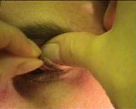 б) большим и указательным пальцами правой руки фиксирует веко за край и ресницы, оттягивая его вниз и вперед;