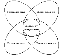 Данный рисунок позволяет увидеть еще одну важную особенность политического менеджмента как объекта научного интереса – он может быть комплексно изучен только в том случае, если произойдет интеграция предметных полей и методологических подходов, созданных и апробированных в рамках всех научных дисциплин: политологии, социологии, психологии и теории управления (менеджмента).