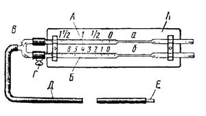 В настоящее время для определения вязкости крови используют вискозиметр Гесса с двумя капиллярами. Прибор для определения относительной вязкости крови состоит из двух градуированных пипеток А и Б с двумя одинаковыми капиллярами а и б в средней части, укрепленных на общей подставке П. Концы пипеток соединены тройником В, от которого идет резиновая трубка Д со стеклянным наконечником Е. Пипетка Б имеет разобщительный кран Г. При измерениях, открыв кран Г и втягивая ртом воздух через наконечник Е, наполняют пипетку Б водой по метке 0. Затем, закрыв кран, наполняют пипетку А исследуемой кровью до такого же уровня (все исследование должно производиться быстро, чтобы кровь не свернулась). Затем открывают кран Г и, энергично втягивая ртом воздух, всасывают жидкости из обеих пипеток так, чтобы кровь дошла до метки 1. При этом вода, как менее вязкая жидкость, дойдет до более высокой метки, которая укажет относительную вязкость крови. Отношение вязкости крови и вязкости воды при той же температуре называют относительной вязкостью крови: