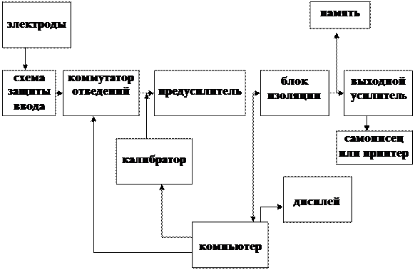 Примером прибора, использующего усилитель биопотенциалов, может служить электрокардиограф. Ниже приводится перечень основных его блоков и схема их соединения (рис. 9).