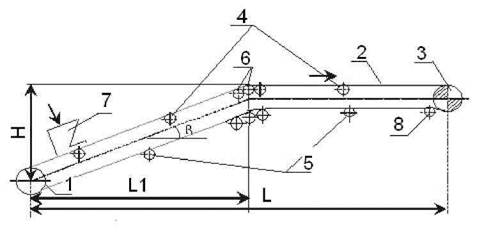 1 – натяжной барабан; 2 – тяговый и грузонесущий рабочий орган (лента); 3 – приводной барабан; 4 – роликоопоры рабочей ветви конвейера; 5 – роликоопоры обратной ветви конвейера; 6 – батарея роликоопор; 7 – загрузочное устройство; 8 – отклоняющие роликоопоры.