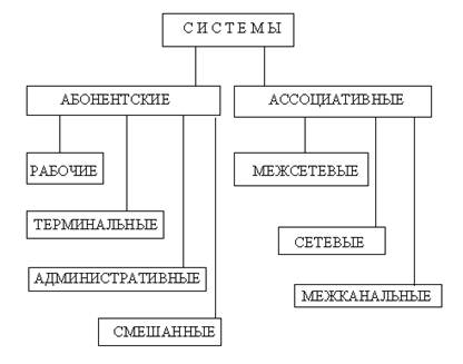 Выделим (рис. 1.6) два типа систем: абонентские и ассоциативные. Абонентской называется система, предоставляющая в сети ПрП или использующая эти процессы. Система, предназначенная для обеспечения передачи информации между абонентскими системами, называется ассоциативной. В соответствии с этими определениями основными в ИВС являются абонентские системы. Ассоциативные системы являются вспомогательными и могут вообще отсутствовать. В зависимости от функций абонентские системы подразделяются на четыре вида.
