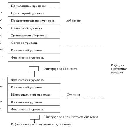 В реальных условиях абонентскую систему удобно реализовать в двух технических блоках. Типовая структура такой системы показана на рис. 1.7. Она состоит из абонента и станции. Здесь абонентом является основная часть системы, реализованная в ЭВМ, которая выполняет прикладные процессы и функции части области взаимодействия открытых систем. Станцией называется устройство, сопрягающее ЭВМ с физическими средствами соединения и реализующее функции остальной части области взаимодействия. Обе части функций области взаимодействия открытых систем связываются внутрисистемной вставкой, обеспечивающей интерфейс абонента со станцией.