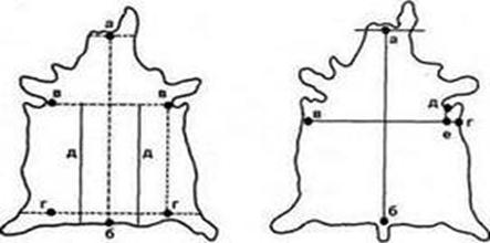 Площадь овчины определяют в квадратных дециметрах путем умножения длины шкуры, измеренной от верхнего края шеи до основания хвоста, на ширину, измеряемую по линии на 3-4 см ниже нижних впадин передних конечностей (рисунок 8).