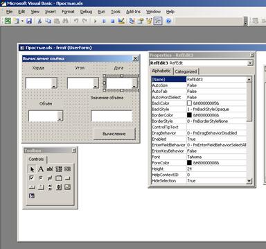Для загрузки формы надо войти через панель Visual Basic в интегрированную среду разработки и выбрав в меню пункты «Insert»à «UserForm» вставить форму. На панели элементов управления находятся текстовое поле – TextBox, командная кнопка – CommandButton , надпись – Label и другие элементы управления, свойства которых подобны соответствующим в VB, хотя названия несколько отличаются. Но есть дополнительные элементы, которые специфичны именно для Excel, а именно редактор ссылок – RefEdit, с помощью которого можно указывать мышью ячейки для ввода и вывода данных. Дадим форме имя (свойство Name) «frmV» и название (свойство Caption) «Вычисление объёма» в окне свойств (Properties). Поместим на форму три элемента управления RefEdit для ввода адресов ячеек с рабочего листа содержащих значения хорды, угла, дуги с именами по умолчанию RefEdit1, RefEdit2, RefEdit3 соответственно и для адреса ячейку, которая получит значение объёма (RefEdit4). Также поместим текстовое поле (TextBox1) для параллельного вывода значения объёма на форму и командную кнопку (CommandButton1) для запуска процедуры вычисления.