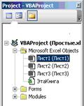 Итак, проект содержит стандартный модуль с общедоступной (Public) функцией фнкОбъём(), форму со своим модулем, где находится локальная (Private) процедура ввода, вычисления, вывода данных и модуль рабочего листа «Лист1» с процедурой вызова формы .