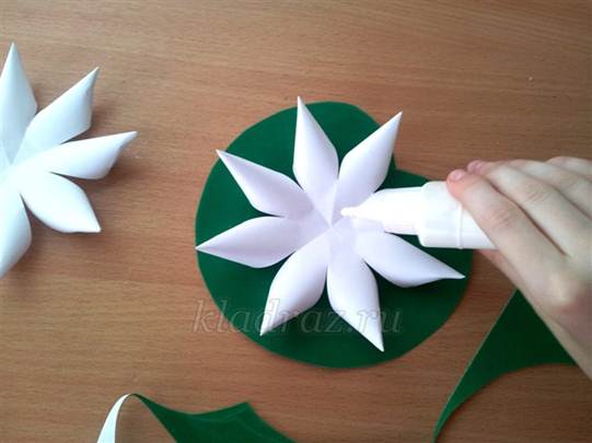 9. На зелёный лист приклеиваем одной каплей клея нижний венчик.