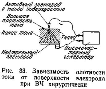 Для решения этих проблем успешно используют теплотвоо-ное действие высокочастотных токов: ведь тепловую энергию, возникающую в тканях, можно использовать для резания. Если применять большие плотности тока (иначе говоря, ВЧ ток вводить в ткани через электрод с малой поверхностью) (рис. 33), то в результате быстрого нагревания клеточная жидкость в клетках быстро вскипает и клетка «взрывается». Выбрав мощность и передвигая электрод с соответствующей скоростью, можно добиться такого положения, что электрод ВЧ хирургического прибора рассе-