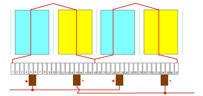 Последователь уложенные секции простой волновой обмотки образуют две параллельные ветви прохождения тока, причем рабочие стороны последовательно включенных секций располагаются под всеми полюсами машины и оказываются в абсолютно равных условиях и равных магнитных потоках.