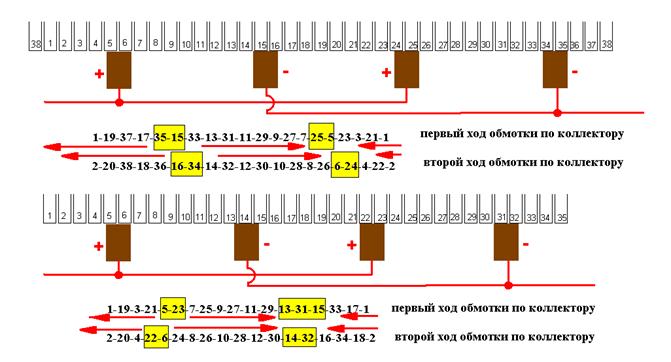 Если увеличить число коллекторных пластин на одну или уменьшить на три и сохраним шаг по коллектору получим сложную двухзаходную волновую обмотку.