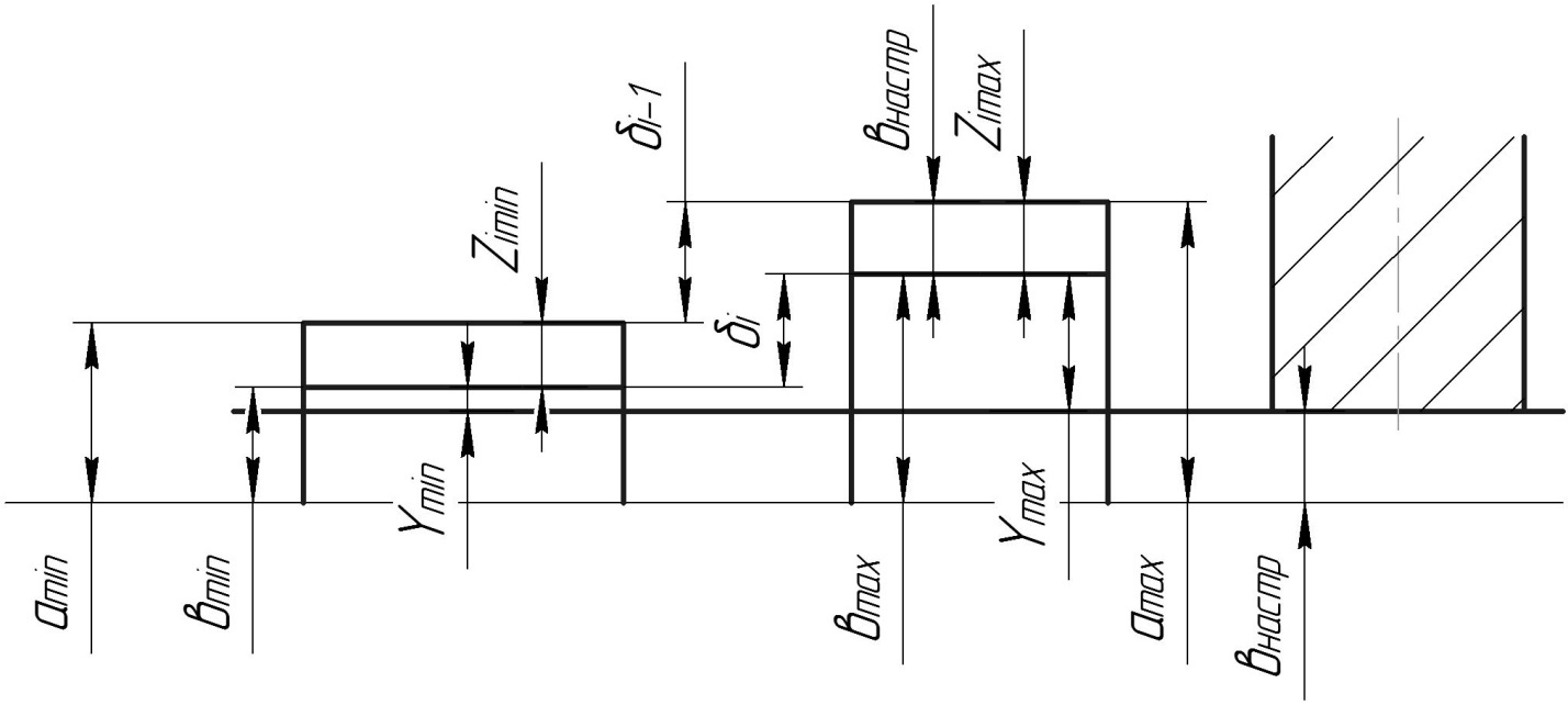 Принятые обозначения на рис. 13: amin и amax - соответственно минимальный и максимальный размеры заготовки; δi-1 - допуск заготовки; i- выполняемый переход; i-1 предшествующий переход (в данном случае переход получения заготовки); bmin и bmax - соответственно минимальный и максимальный размеры детали, получаемые при выполнении i-го перехода; δi- допуск размера детали; Zmin и Zmax - минимальный и максимальный припуски (фактические); bнастр - настроечный размер.