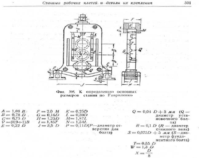 На основе опытных данных американских заводов А. П. Гавриленко для определения размеров станин, исходя от диаметра валка, дает следующие эмпирические зависимости (фиг. 395).