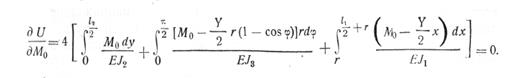 В случае применения принципа наименьшей работы для нахождения статически неопределимого момента Мо, частная производная потенциальной энергии U рамы по моменту Мобудет равна нулю: