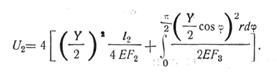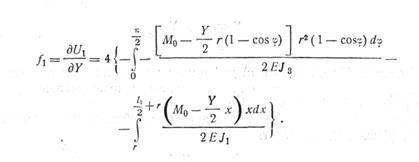 Обозначая моменты инерции сечений поперечин, стоек, мест с закруглениями через J1,J2,J3, а площади этих сечений через F1,F2,F3, при равных радиусах закруглений (во всех углах) по нейтральной линии r, длине поперечин и стоек l1,l2, составляем уравнение потенциальной энергии от действия изгибающего момента для одного квадранта рамы; умножая же его на 4, получим полную энергию: