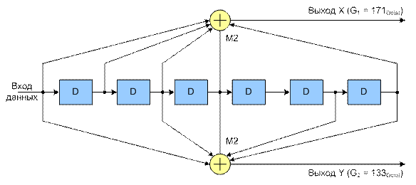 Для внутреннего кодирования в системе DVB-Т используются выколотые сверточные коды с рядом скоростей от 1/2 до 7/8. Все они получаются из исходного кода, имеющего скорость 1/2 с длиной кодового ограничения К = 7, что соответствует 64 состояниям решетчатой диаграммы. Структурная схема сверточного кодера показана на рисунке 4.4. Генераторные полиномы двух его ветвей определяются выражениями (в восьмиричном коде) G1 = 171Oct и G2 = 133Oct.