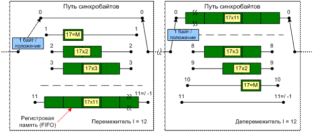 После внешнего кодирования производится операция внешнего перемежения в сверточном побайтовом перемежителе структуры Форни с глубиной перемежения I = 12, структурная схема которого показана на рисунке 4.3.