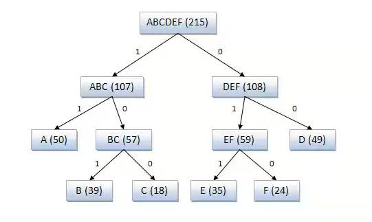 Код Шеннона — Фано строится с помощью дерева. Построение этого дерева начинается от корня. Всё множество кодируемых элементов соответствует корню дерева (вершине первого уровня). Оно разбивается на два подмножества с примерно одинаковыми суммарными вероятностями. Эти подмножества соответствуют двум вершинам второго уровня, которые соединяются с корнем. Далее каждое из этих подмножеств разбивается на два подмножества с примерно одинаковыми суммарными вероятностями. Им соответствуют вершины третьего уровня. Если подмножество содержит единственный элемент, то ему соответствует концевая вершина кодового дерева; такое подмножество разбиению не подлежит. Подобным образом поступаем до тех пор, пока не получим все концевые вершины. Ветви кодового дерева размечаем символами 1 и 0, как в случае кода Хаффмана.