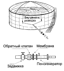 Пену подают через слой горючего вещества с помощью специального оборудования резервуара или через борт резервуара в виде навесной струи с помощью пенных стволов.