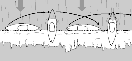 - Направьте нос лодки во впадину перед валом и поставьте лодку строго против течения.
