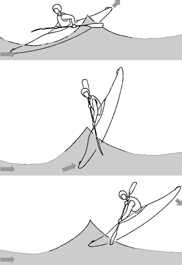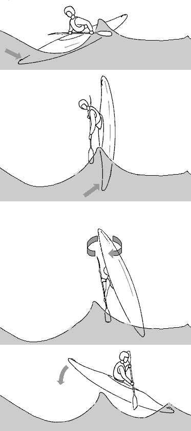 Дальнейшее движение лодки зависит от мощности потока и действий гребца. На небольшом валу лодка не встает строго вертикально и падает обратно дном вниз, ниже по течению. (В предыдущей главе такая "свечка" рассматривалась как один из способов выхода из бочки.) Гребец может способствовать этому движению, откинувшись назад и прижимаясь к корме лодки. В более мощной струе лодка совершает полный оборот в вертикальной плоскости и падает в воду вверх килем. Чтобы более надежно выполнить такой кувырок, гребец наклоняется вперед и прижимается к носу лодки. Впоследствии из этого же положения естественно выполняется переворот "винтом".