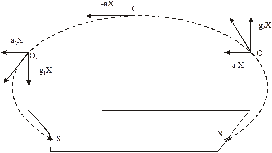 Рассмотрим действие судового магнетизма в точке O. Имеем случай, когда судно намагничено по продольной оси и действие судового магнетизма тоже проявляется в продольном направлении. В уравнениях Пуассона это действие выражается составляющей aX.