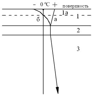 | Суточные колебания температур практически не сказываются глубже 1,5 м. На территориях, где не бывает морозной зимы, температуры в зоне 1 всегда положительные (рис. 3, кривая «а»), а в районах с морозными зимами в зоне 1 появляется подзона 1а, где грунты в зимнее время замерзают. Это сезонная мерзлота. В ней дисперсные и техногенные грунты замерзают за счёт перехода в их порах воды в твёрдое состояние (лёд). В скальных грунтах вода замерзает в трещинах и активно их разрушает за счёт расклинивающего действия образующегося льда (увеличение объёма льда достигает 9,1%). |