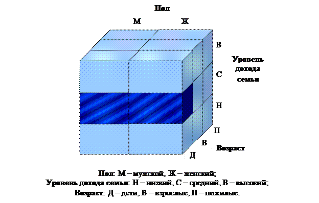 Критериями сегментации рынка шоколадных изделий могут быть емкость и доходность сегмента, а признаками – пол, возраст, уровень дохода семьи. Все признаки, за исключением пола, в нашем случае принимают три значения (см. рис. 3.1). Согласно методу многомерной классификации сегментация осуществляется одновременно по трем анализируемым признакам. Таким образом, выделяется 2´3´3=18 сегментов рынка.