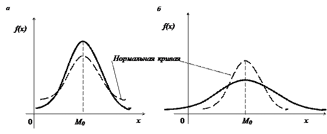 , то кривая распределения имеет более низкую и пологую вершину, чем нормальная кривая (рис. 13,б). При этом сравнении предполагается, что данное и нормальное распределения имеют одинаковые математические ожидания и дисперсии.