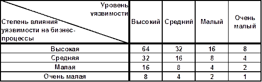 Для такого оценивания может быть применена таблица, (Таблица 9)в которой строками являются уровни степени влияния уязвимости на бизнес-процессы , столбцами — уровни уязвимостей.