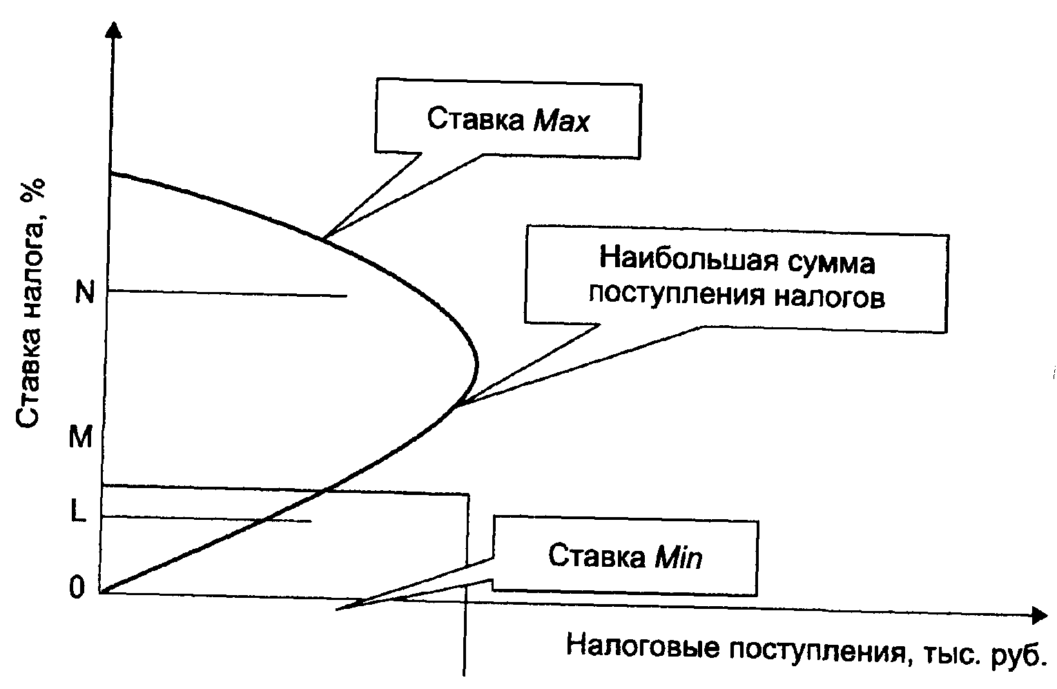 Поступления зависят не только и даже не столько от ставки налога, сколько от налоговой базы.С ростом ставки достигается известный предел, после которого дальнейшее ее повышение сопровождается уже не увеличением, а сокращением производства, т.е. налоговой базы, снижением налоговых поступлений.