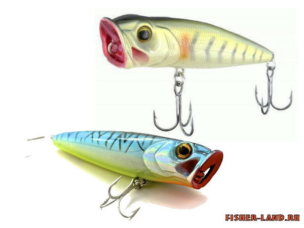 ПОППЕРЫ (River 2 Sea Bubble Popper) – поверхностный воблер без лопасти с чашевидным углублением спереди на торце. Во время рывковой проводки немного ныряет в воду и тут же выныривает. Издает характерные булькающие звуки в воде, чем приманивает хищника.