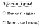 CheckboxGroup delivery = new CheckboxGroup();Checkbox fast = new Checkbox( "Срочная (1 день)", delivery, true);fast.setBounds(10, 10, 150, 20);add(fast);Checkbox normal = new Checkbox( "Обычная (1 неделя)", delivery, false);normal.setBounds(10, 30, 150, 20);add(normal);Checkbox postal = new Checkbox( "По почте (до 1 месяца)", delivery, false);postal.setBounds(10, 50, 150, 20);add(postal);Ниже приведен внешний вид такого контейнера:
