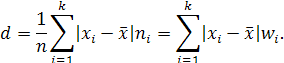 Среднее линейное отклонение (d) – средняя арифметическая абсолютных величин отклонений вариантов от их средней: