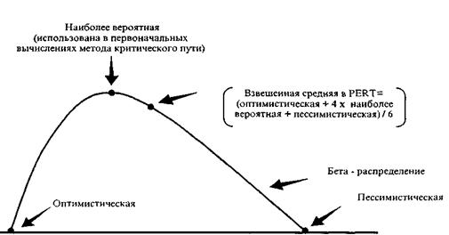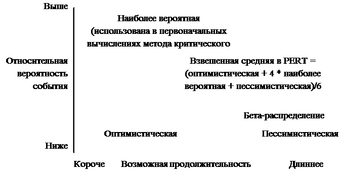 • Техника обзора и оценки проекта (PERT) - использует последовательную сетевую логику и средневзвешенные оценки продолжительности для вычисления продолжительности проекта. Хотя существуют и внешние различия, PERT отличается от метода критического пути тем, что использует величину из распределения (ожидаемое значение) вместо наиболее вероятной оценки, первоначально используемой в методе критического пути (рис. 3.5). Сам по себе PERT редко используется сегодня, хотя PERT - подобные оценки часто используются в вычислениях метода критического пути.